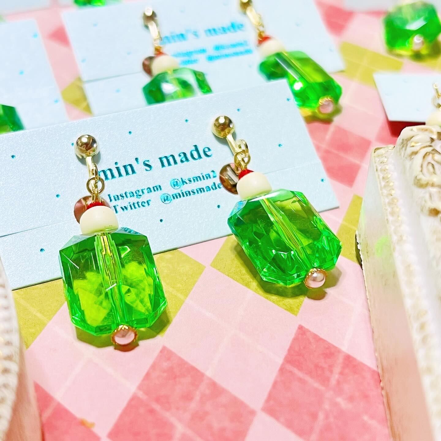 宝石型のドイツアクリル・アイスに見立てたマットカラーのビーズ・スワロフスキーを合わせ、メロンクリームソーダに見立てた作品◎
