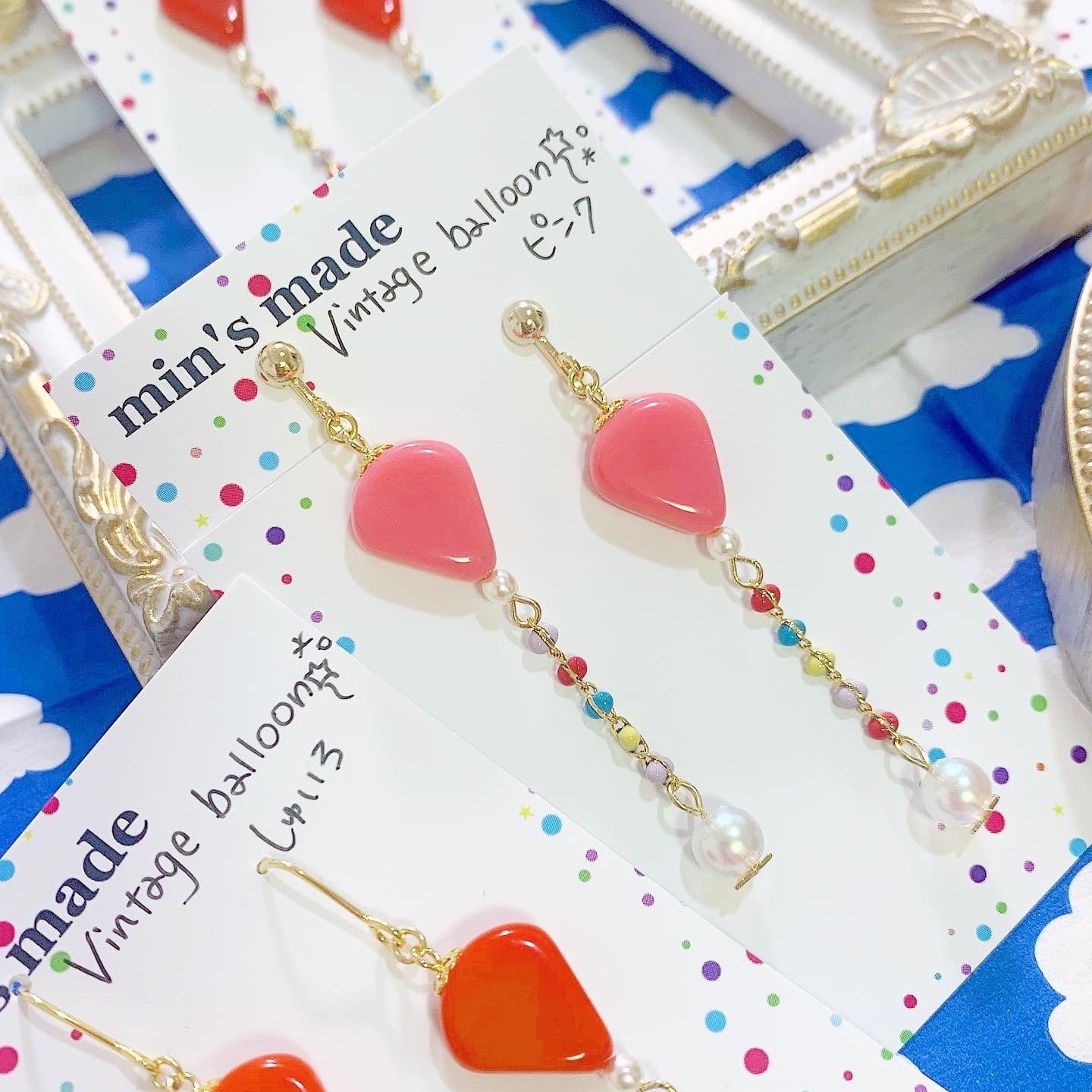 ぷりんっ♪と可愛いヴィンテージのアクリルビーズを風船に見立てて製作したイヤリング&ピアス◎